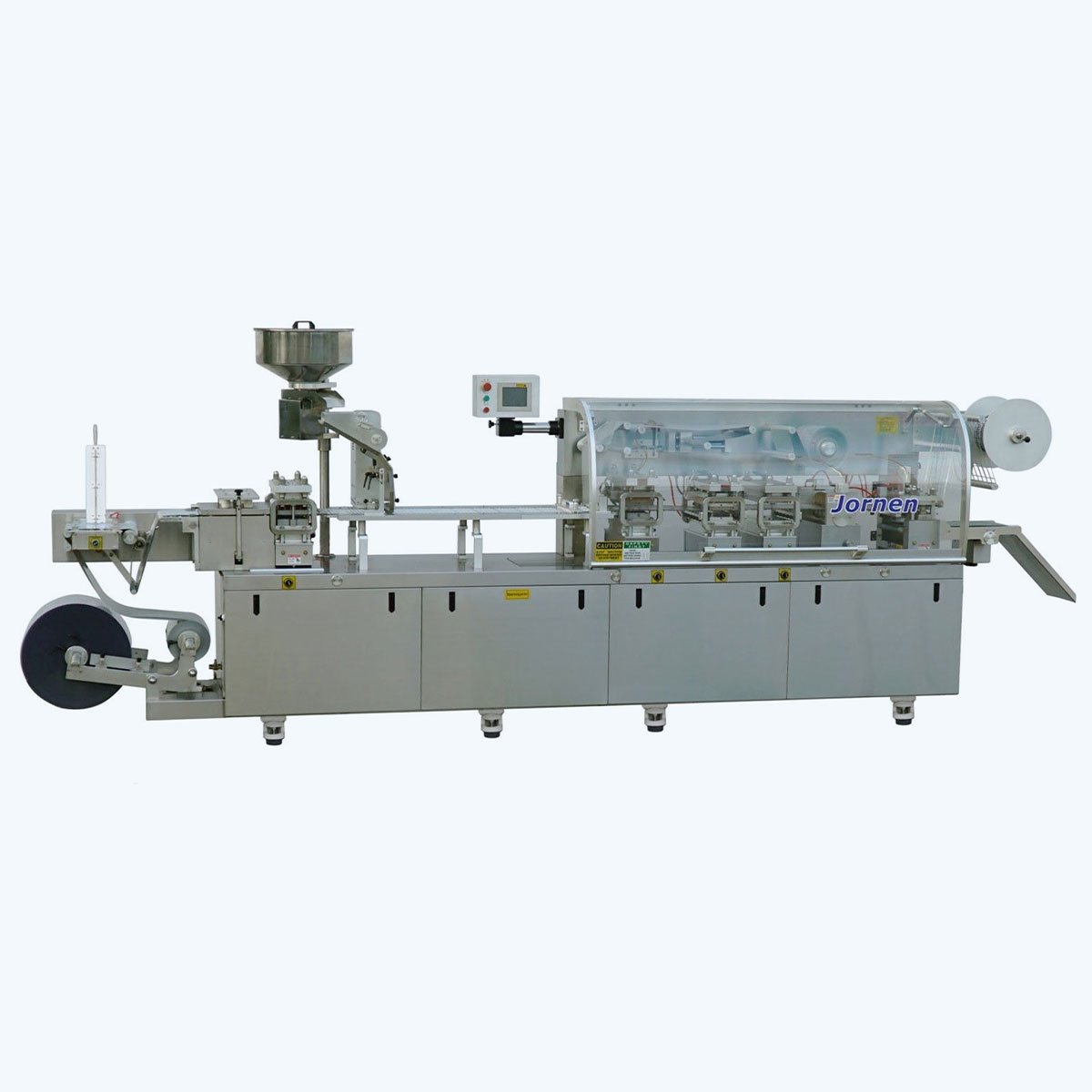 - آلة تغليف مدمجة (تعمل بنظام الومنيوم/بي في سي و الومنيوم /بي في سي / الومنيوم و الومنيوم/الومنيوم ) ، تتميز بنظام تحديد المواقع ، المجهز بقفل التنسيق التلقائي ، وفي محطة االلحام ، عندما تتوقف الآلة ، يمكن أن يرتفع قالب ختم التسخين. تلقائيًا لمنع الهواء الساخن من الدخول إلى حجرات الشريط بحيث يتم الحفاظ على فعالية الدواء.